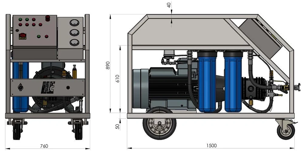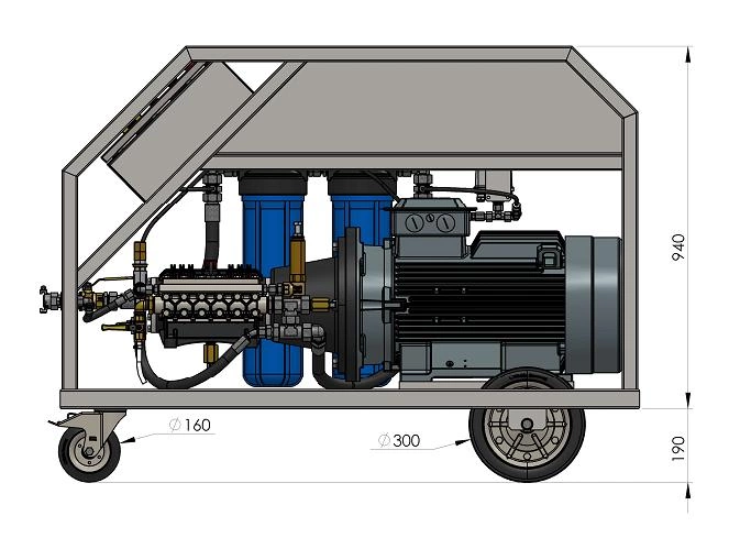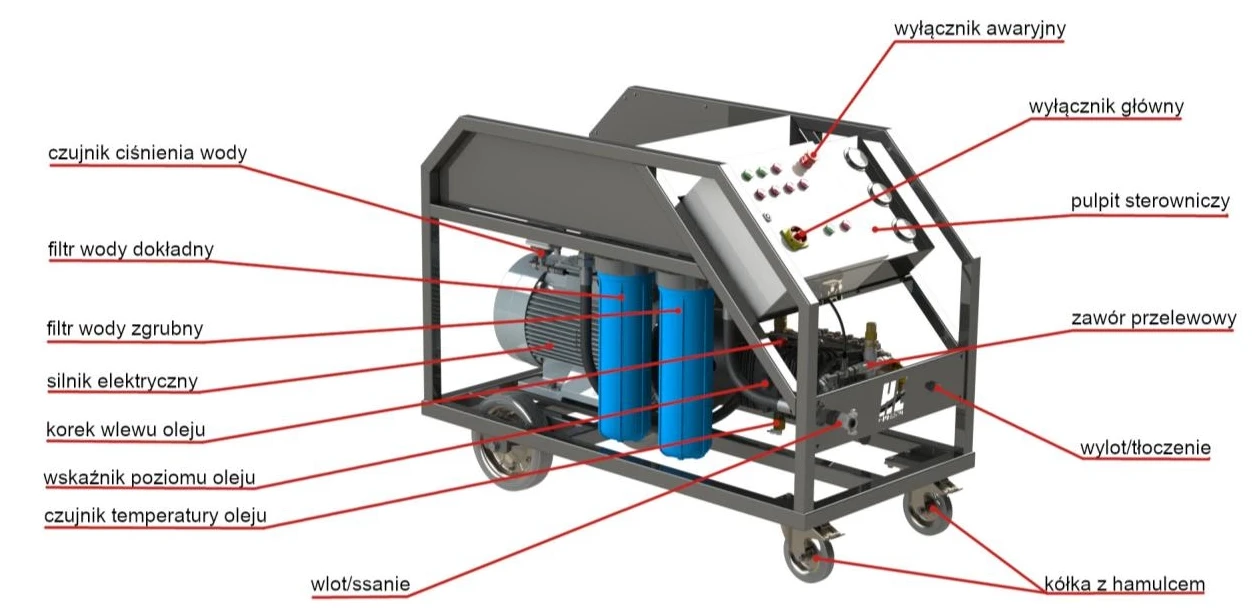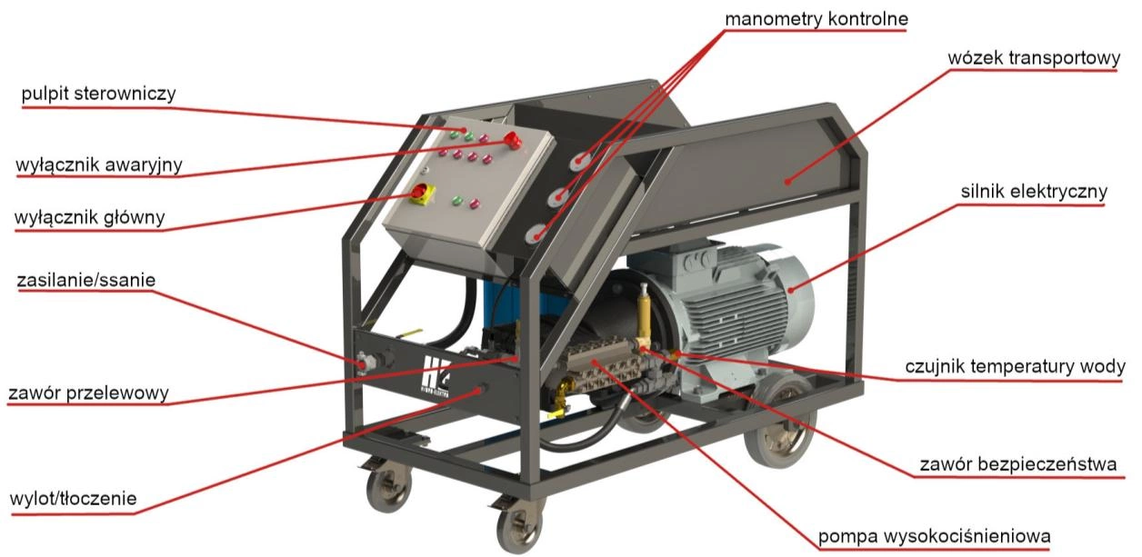 Maszyna przeznaczona jest do czyszczenia hydrodynamiczną strugą pod wysokim ciśnieniem wody. Agregat jest uniwersalnym urządzeniem do czyszczenia elementów o zróżnicowanych kształtach i wielkościach powierzchni (np. powierzchnie płaskie, elementy maszyn, rury i inne). Po wyposażeniu maszyny w specjalną dyszę i zestaw akcesoriów możliwe jest jej wykorzystanie do hydropiaskowania.